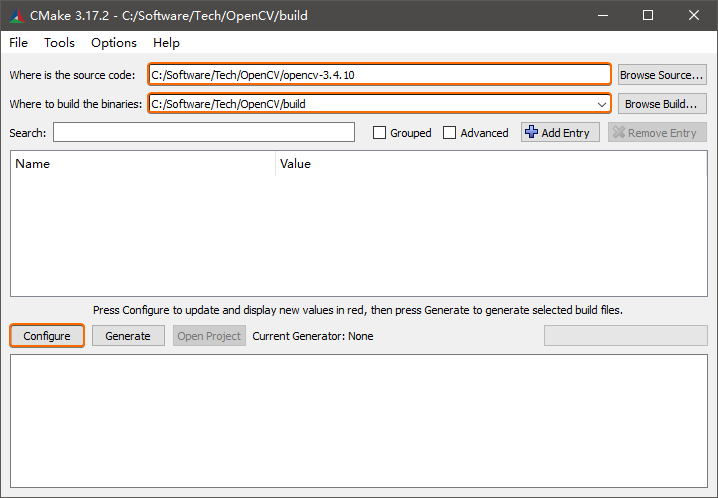 图形界面配置工具,选择opencv-3.4.10源码包的位置以及编译输出的build目录: