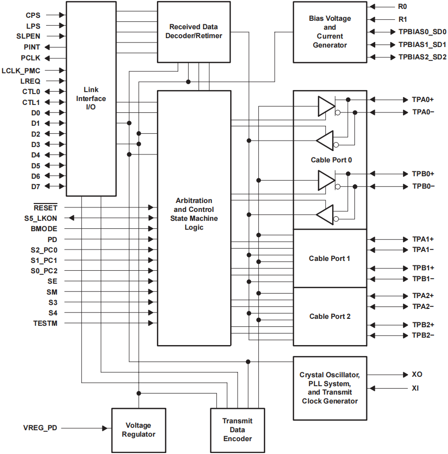 下图展示的是一款同时支持 IEEE 1394-1995、IEEE 1394a-2000、IEEE 1394b-2002 协议标准的 PHY 物理层芯片: