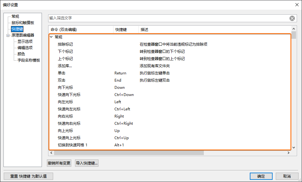 除此之外,还可以打开原理图编辑器当中的【偏好设置 ➞ 快捷键】菜单,由用户自定义快捷键: