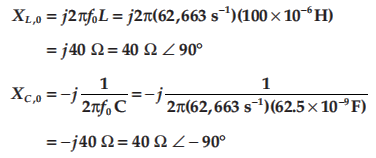 \[ \begin{aligned} I_R &= \frac{V_S}{R_P} = \frac{10 VAC}{9510Ω} = 1 mA \\ I_L &= \frac{V_S}{X_L} = \frac{V_S}{2 \pi f L} = \frac{10 VAC}{2 \pi \times (10.07 \times 10^6 s^{-1})\times(5.0 \times 10^{-6}H)} = \frac{10 VAC}{316Ω} = 32mA \\ I_C &= \frac{V_S}{X_C} = \frac{V_S}{\frac{1}{2 \pi f C}} = \frac{10 VAC}{\frac{1}{(2 \pi) \times (10.07 \times 10^6 s^{-1}) \times (50.0 \times 10^{-12}F)}} = \frac{10 VAC}{316Ω} = 32 mA \end{aligned} \]