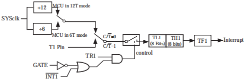 6T模式时, 定时器 1 的溢出率等于单片机时钟频率 ÷ 6 ÷ (256-TH1)。 - 当单片机工作在