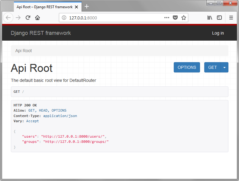 由于在前面代码中,我们使用了ViewSets代替Views,通过简单的将viewSets注册到router类,所以我们能够方便的为